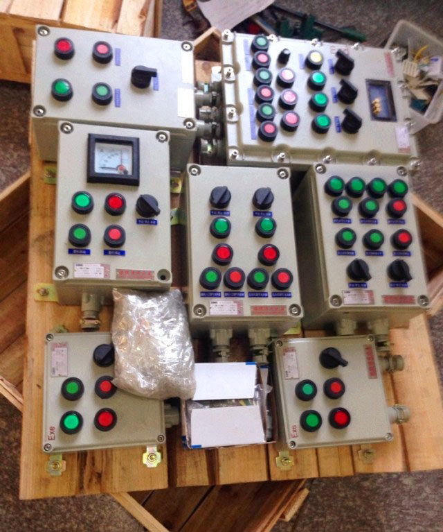 二、防爆控制箱。此類防爆控制箱型號(hào)為BXK52系列,其中X是箱體的簡(jiǎn)稱,K為控制的縮寫(xiě)。防爆控制箱主要用于控制各類電機(jī)或者輔助電器,主要由防爆按鈕和防爆指示燈組成。防爆控制箱箱體材料一般分為三種,即鋁合金、鋼板焊接和不銹鋼焊接。防爆控制箱箱體除安裝上述按鈕和指示燈外,還可以根據(jù)客戶要求安裝轉(zhuǎn)換開(kāi)關(guān)、電流表、電壓表以及制定的各類儀表。